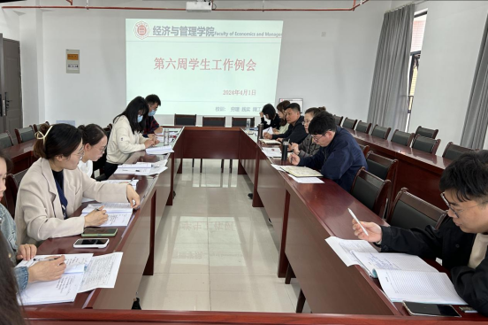 2024年4月1日中午,太阳成集团122ccvip在行政楼725办公室召开本学期第六周员工管理工作例会,副经理秦品德、书记助理叶赵强、经理助理张珊以及全体辅导员参加会议,会议由吴玲经理主持。