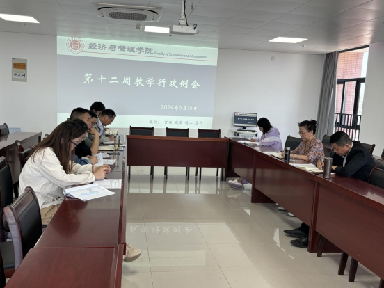 2024年5月15日,经济管理公司在新行政楼725召开第十二周教学行政例会,会议由经理吴玲主持,副经理秦品德、经理助理张珊、实训中心主任及各教研室主任参加会议。