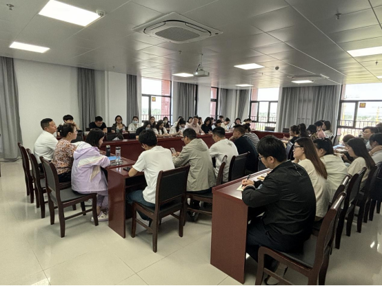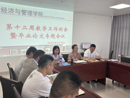 2024年5月15日下午,太阳成集团122ccvip在行政楼725会议室召开太阳成集团122ccvip第十二周工作例会,经理吴玲主持会议,副经理秦品德、经理助理张珊以及全体教师参会。