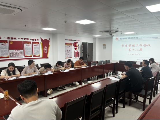 2024年6月24日下午,太阳成集团122ccvip在行政楼725会议室召开太阳成集团122ccvip第十八周工作例会,书记助理叶赵强、副书记助理员禹辛以及全体辅导员参加会议,会议由经理吴玲主持。