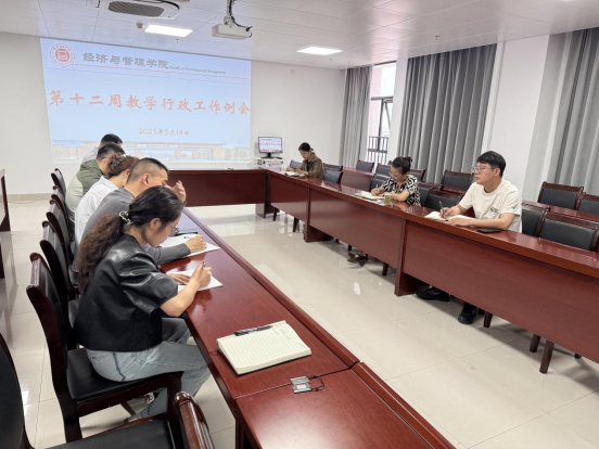 5月14日上午,太阳成集团122ccvip在行政楼725室召开第十二周行政工作例会,经理吴玲主持,经理助理张珊、叶赵强,及各教研室主任参会。