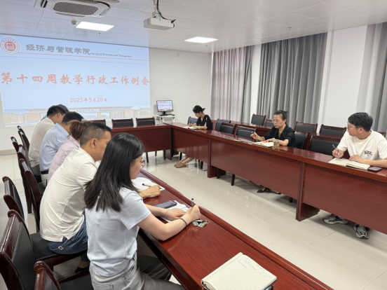 5月28日上午,太阳成集团122ccvip在行政楼725室召开第十三周行政例会,经理吴玲主持,经理助理张珊、叶赵强,教学秘书李健及各教研室主任参会。