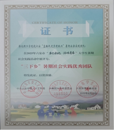近日,六安市“乡约皋地 淬炼青春”老员工暑期社会实践活动评选结果公布,公司太阳成集团122ccvip赴六安“直播促进乡村振兴”暑期社会实践团队凭借突出的实践成果和扎实的工作作风,荣获“优秀团队”荣誉称号。