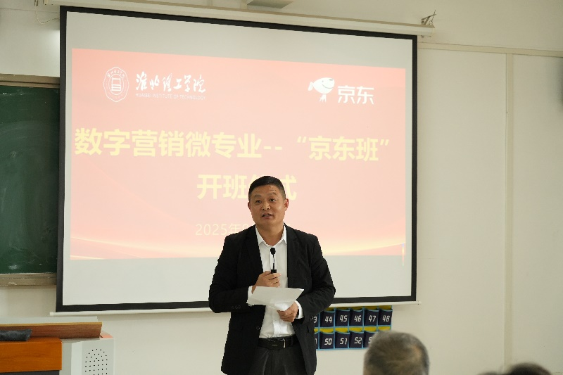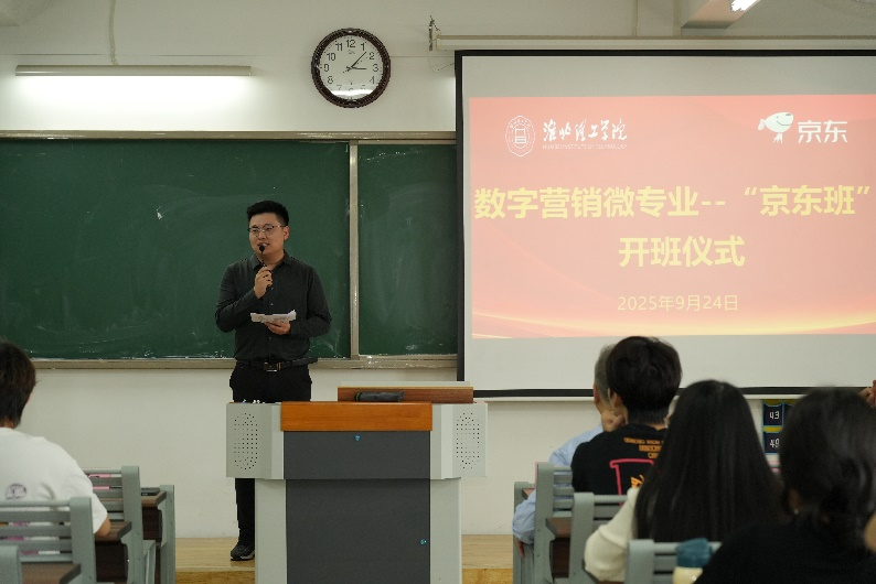 汪建利在致辞中感谢京东对微专业的支持,对成功入选京东班的同学表示祝贺。他指出,与京东共建“数字营销微专业”,是公司深化教学改革、提升人才培养质量的关键举措,是京东把数字营销领域积累的先进理念、实战案例和平台资源引入校园,与公司的经济管理学科优势进行深度融合的典范。他勉励同学们珍惜学习机会,志存高远、脚踏实地、跨界融合,公司将全力支持“京东班”的建设与发展,将“京东班”打造成公司产教融合的标杆项目,为更多同学的成长成才助力。