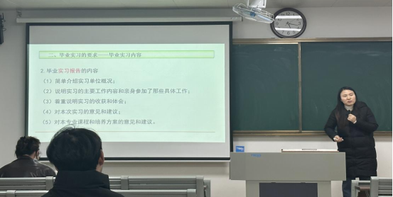 首先,兰露老师针对实习管理规定、安全教育、实习管理手册填写方法、要求,以及对实习考核的重要环节进行了详细说明,并且就毕业实习工作进行了四方面的强调,一是认识到毕业实习是本科人才培养过程中极为重要的教学环节;二是要求实习指导教师与员工加强沟通交流,认真开展实习指导工作;三是要求毕业生做好实习规划,端正实习态度,认真完成实习任务;四是确保人身安全、交通安全等相关工作。