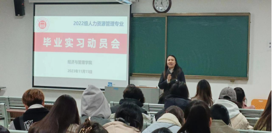 根据专业人才培养方案规定,践行专业教学计划和要求,切实高质量做好2024届本科毕业生毕业实习、毕业论文工作,11月15日下午人力资源管理教研室在二教207教室举行2024届人力资源管理专业毕业实习暨毕业论文撰写动员大会。2024届毕业实习及论文指导老师出席此次会议,2024届全体人力资源管理员工参加本次会议,会议由人力资源管理教研室负责人兰露老师主持。