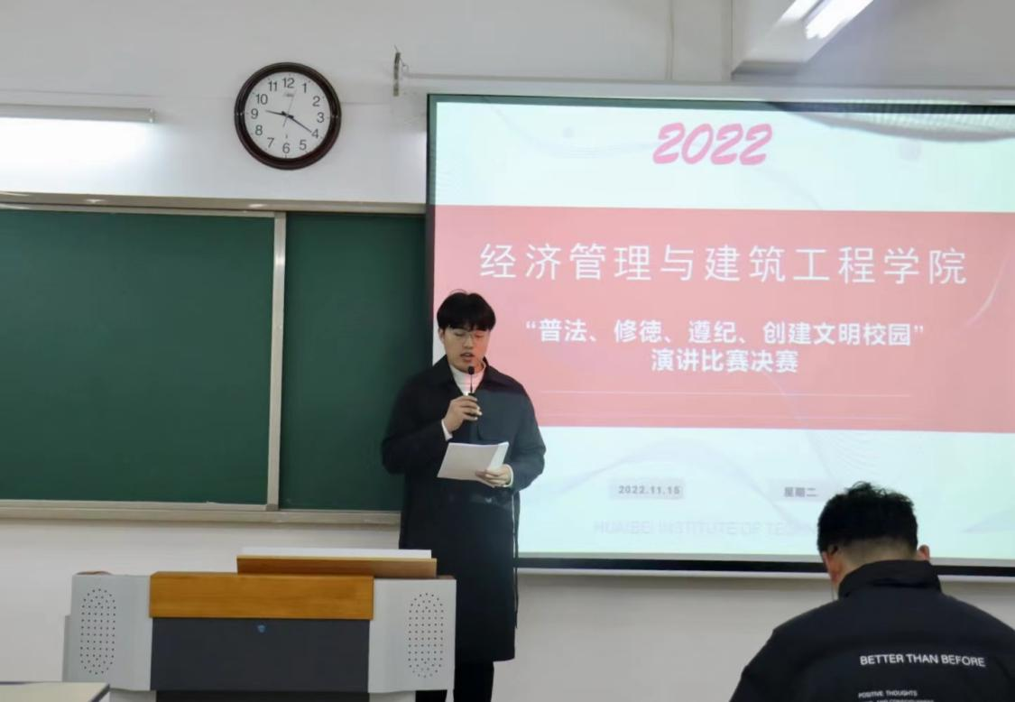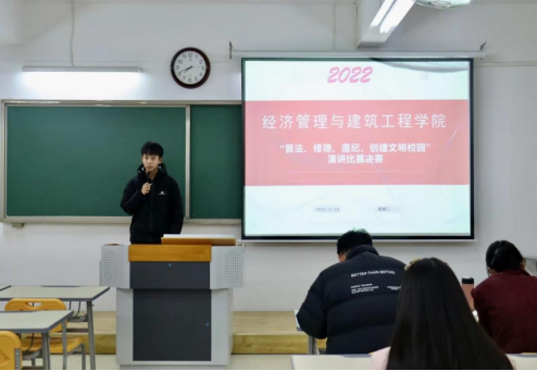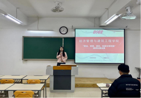 为增强员工法律知识,营造文明和谐的校园氛围,响应公司《关于开展“普法、修徳、遵纪、创建文明校园”专项活动》的文件精神,深入学习习近平法治思想,引导员工深入了解宪法、尊重宪法精神,于2022年11月15日晚七点,在二教323室举行经济管理与建筑工程公司“普法、修徳、遵纪、创建文明校园”演讲比赛。马克思主义公司经理助理陈志操、经济管理与建筑工程公司教工支部书记刘路路、经济管理与建筑工程公司书记助理叶赵强担任本场比赛评委老师,比赛由院员工会宣传部部长韩大壮主持。