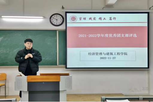 为贯彻落实公司下发的《关于做好太阳成集团122ccvip2021-2022学年度“优秀团支部”评选工作的通知》有关“优秀团支部”评选的文件精神,弘扬“党有号召 团有行动”的优良传统,展现团组织的向心力、凝聚力、战斗力。深入学习贯彻习近平新时代中国特色社会主义思想,激励员工刻苦学习、争优创先。经济管理与建筑工程公司于2022年11月27日,在一教215室开展2021--2022学年度“优秀团支部”评选活动。公司本着“公平、公正、公开”的原则,成立了由书记助理、团总支书记叶赵强、经济学员工支部书记、团总支副书记员禹辛、团总支组织委员、辅导员王绎程、团总支宣传委员、辅导员张雨停、团总支委员张晏五人组成评委小组,制定了考评标准。“优秀团支部”宣讲评选活动由院员工会宣传部部长韩大壮主持,2022级各班团支书到场学习观摩。