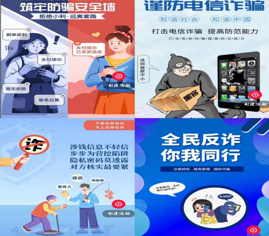 设计反诈海报,让同学们亲自动手实践,加深对反诈的印象。进而通过海报的美观和通俗易懂的形式,来搭建反电信诈骗防线。