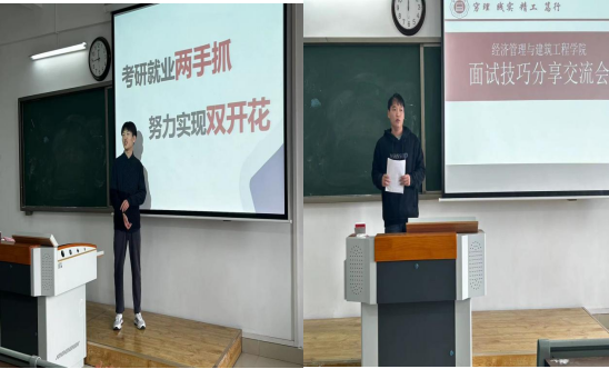 第二部分是由各专业在线下成功面试3家以上企业的员工分享交流,向本专业的员工分享面试注意事项与个人经验技巧;同时指出掌握专业知识对就业的关键作用,面试前应准备好包括英语证书、计算机证书、公司获奖证书、专业资格证书、兼职实习证明等等;还需收集求职公司的企业的排名、企业文化、核心业务等基本信息,了解清楚岗位需求以应对面试问题。在面试时,应该调整好心理状态,口齿清晰、语气平和地表达自己,适当地使用手势来表达观点。