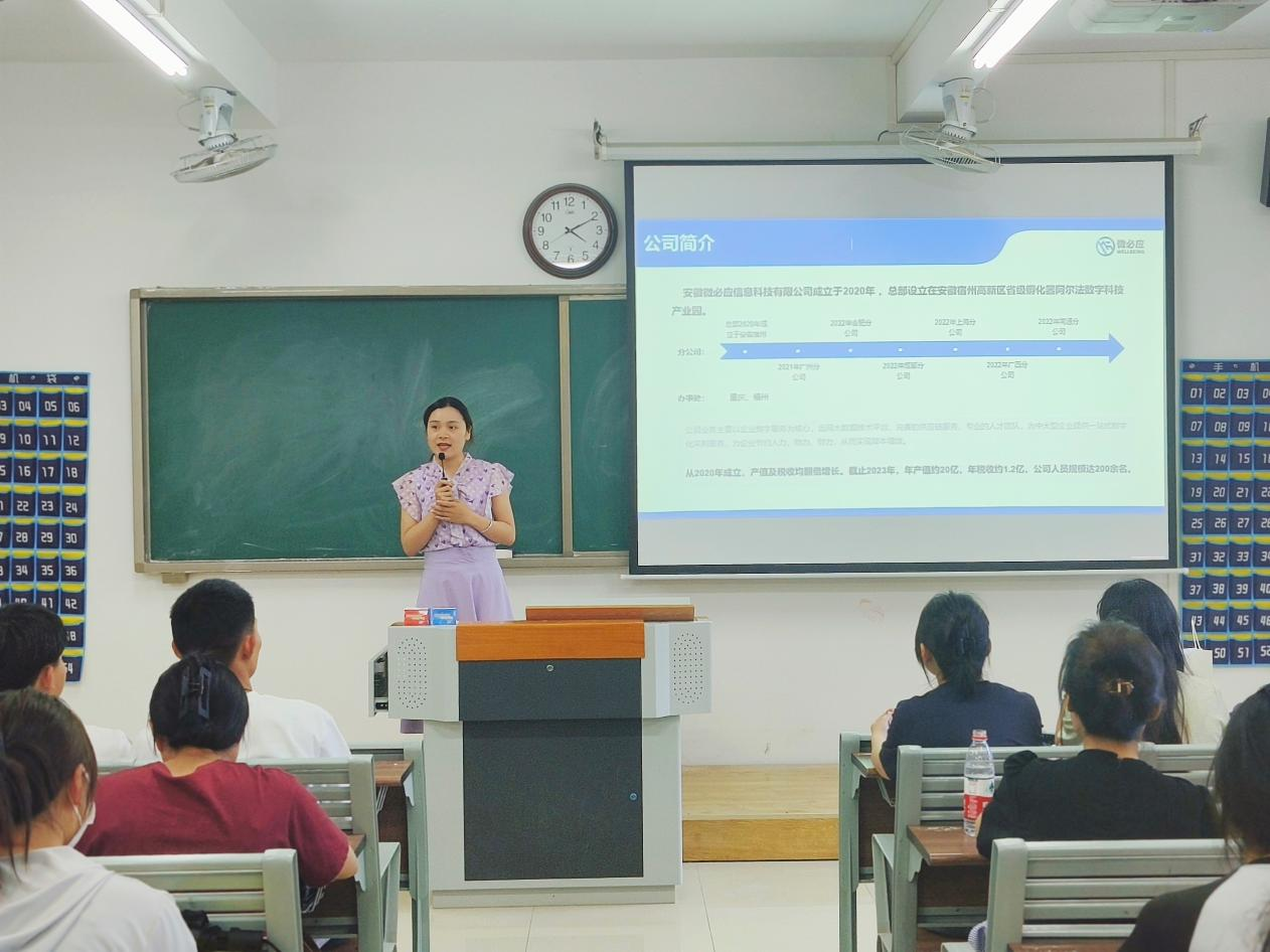 作为一家专注于信息技术研发与应用的企业,安徽微必应信息科技有限公司对经济管理专业员工的综合素质和创新精神给予了高度评价。公司人事代表孙经理在宣讲会上分享了公司的创新成果和未来发展规划,并表达了对优秀人才的渴望。公司承诺,将为毕业生提供全面的技术培训和项目实践机会,助力他们在自身职业发展的道路上不断前行。