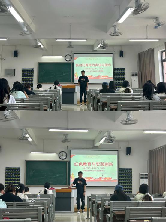 在开展班会过程中,开展了老员工创新创业“青年红色筑梦之旅”的经验分享,2021级经济学专业刘成龙同学作为代表在班会上进行了交流与分享。首先他介绍了老员工创新创业“青年红色筑梦之旅”的背景和意义。他提到,这一活动旨在通过互联网平台,将红色教育资源与青年员工的创新精神相结合,通过线上线下的互动形式,引导青年员工深入了解党的历史,传承红色基因,同时激发他们的创新思维和创业精神。接着,刘成龙详细分享了自己在活动中的经历和感受。他讲述了自己如何通过网络平台学习红色知识,如何与团队成员共同策划、实施项目,以及在这个过程中遇到的挑战和收获。他特别强调了团队合作的重要性,表示只有团队成员之间紧密合作、相互支持,才能克服各种困难,取得最终的成功。