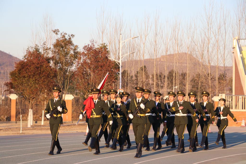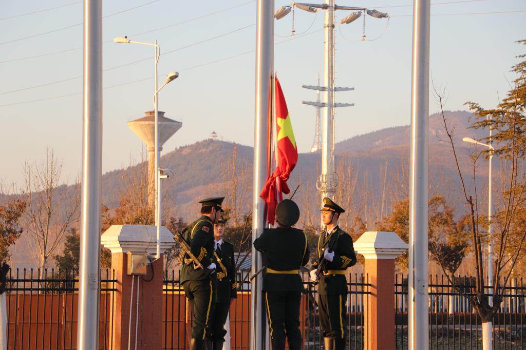 旭日初升之际,师生早早集合完毕,昂首正姿,列队静候。7时20分,国旗护卫队踏着整齐划一的步伐护送国旗入场。伴随着雄壮的《义勇军进行曲》,旗手振臂一挥,鲜艳的五星红旗冉冉升起。全场师生齐唱国歌,行注目礼,心中激荡着对祖国的崇高敬意和无限热爱。