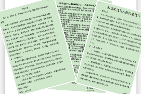 本次活动吸引了众多毕业班学子积极参与,他们结合自身实习和工作经历,踊跃分享职场礼仪和人际沟通方面的实用技巧与心得体会。投稿作品内容丰富,涵盖了职场着装礼仪、商务礼仪规范、有效沟通技巧、团队协作能力等多个方面,为即将步入职场的同学们提供了宝贵的经验参考。