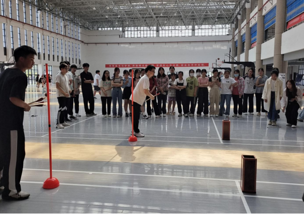 活动初始,由石园园将参赛员工6人一组、分成十组,并讲解活动规则。随后,开始第一项活动——趣味投壶。让各组员先转圈后进行投壶并交替进行,用时最短的小组获胜。本项活动培养了老员工团结合作精神,提高了老员工的心理素质。