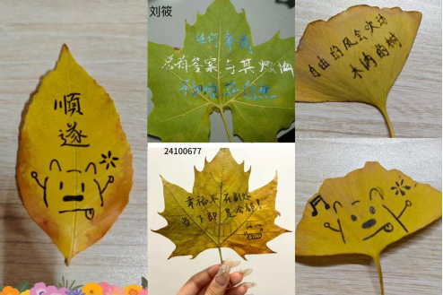 本次活动采取线上征集作品的方式,参与活动的同学们需在校园内搜集枫叶,并以此为基础进行创作与设计。在主题选择上,有些作品从人生观、价值观的视角展现;在材料运用上,选择了多种造型、颜色的枫叶;在设计形式上,同学们展现出各自独特的设计思路、理念以及色彩搭配技巧。